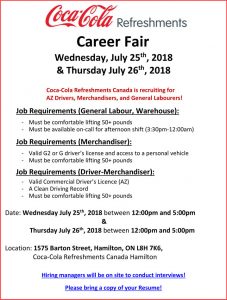 Coca-Cola-Career-Fair By employmenthamilton Posted July 23, 2018 In 0 0 Recent PostsAcademic Upgrading @ ABEALooking for Work in the Skilled Trades?Affordable Bus Pass Program