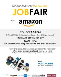 Upcoming-Job-Fairs-September-2018-Amazon-College-Boreal By employmenthamilton Posted September 26, 2018 In 0 0 Recent PostsAcademic Upgrading @ ABEALooking for Work in the Skilled Trades?Affordable Bus Pass Program